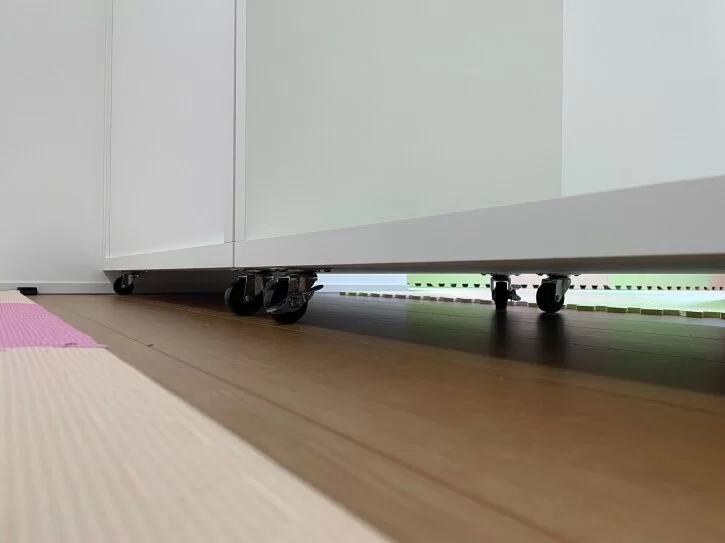 下の写真はワードローブの足元です。移動に便利なキャスターがついていて、動かないように固定もできるようなものを選びました。