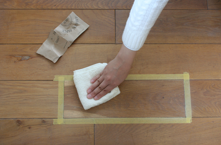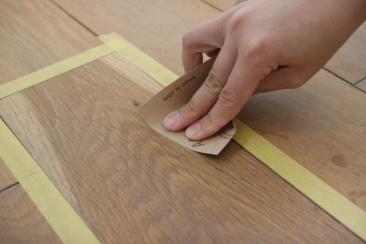マスキングテープで囲った内側の部分があまりムラにならないように、木目に沿って全体的にかけてください。