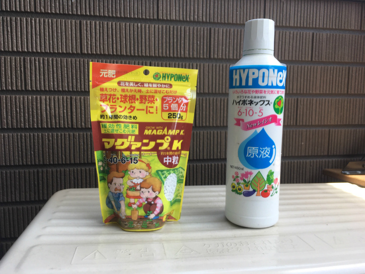 上の写真で左の【マグァンプ】が今回、使用した緩効性の肥料です。