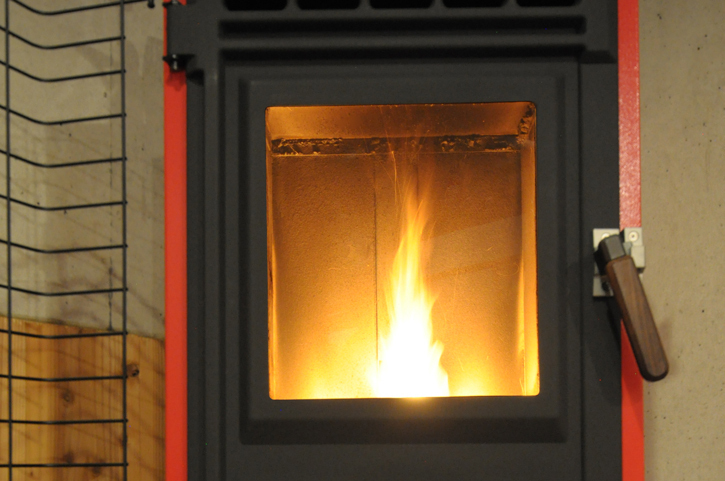 下の写真のように色が赤く、めらめらと大きく揺れていて、煙が出たりしているときは、空気の量が足りなかったり、ペレットの量が多かったりします。