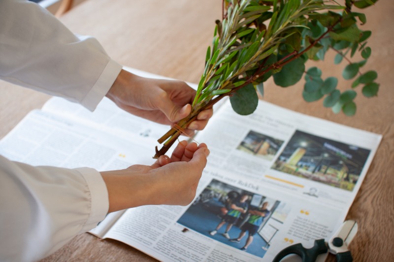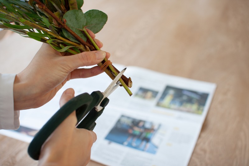 まずは、お花やグリーンの長さを揃えていきます。束ねた時をイメージしながら、大体同じ長さになるように整えてくださいね。特に長さのあるグリーンは、二つに分けて使うと使いやすくおすすめですよ。