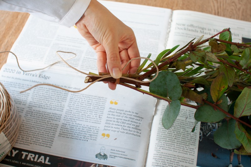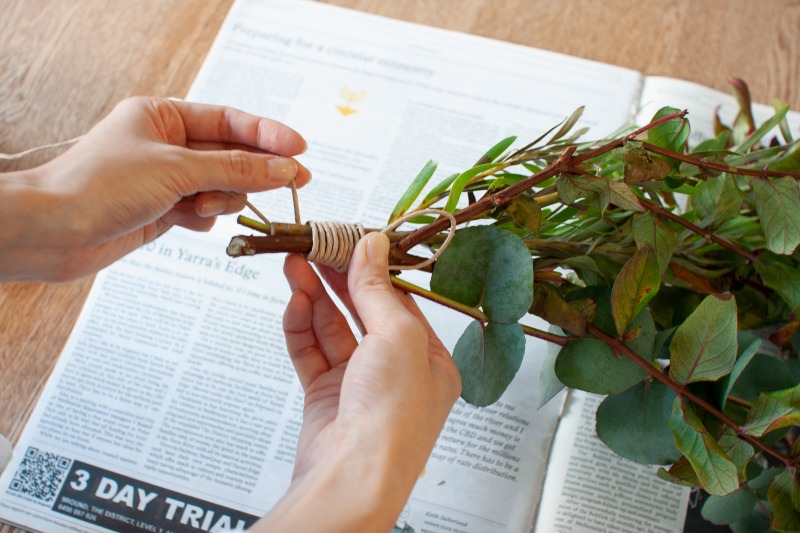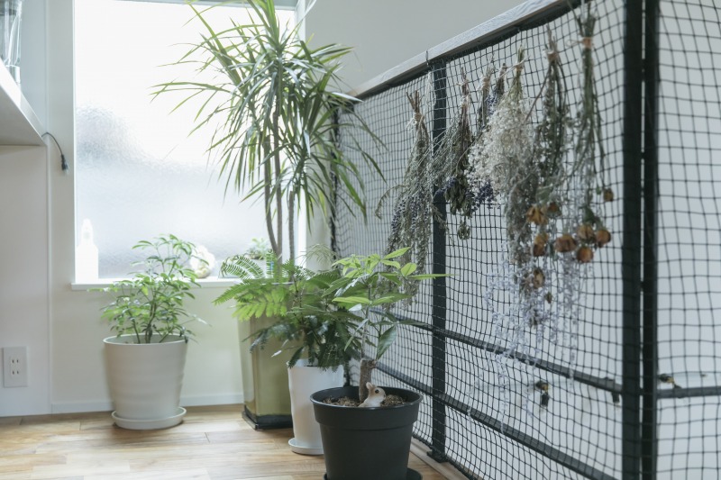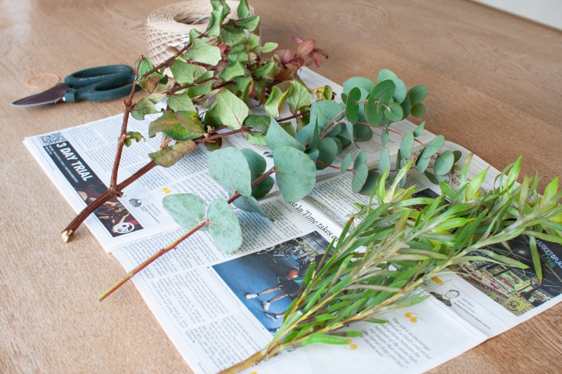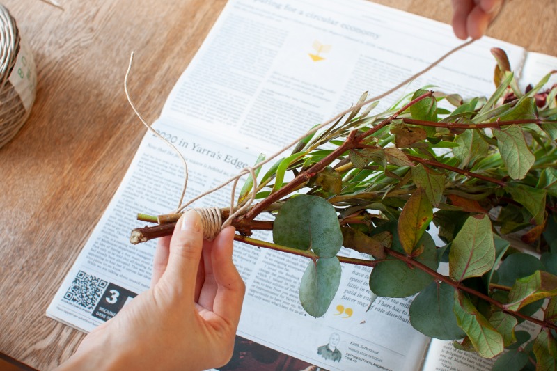 乾いていくと枝木が縮み、吊るしている間に花材が抜けてしまうので、しっかりと行ってくださいね。