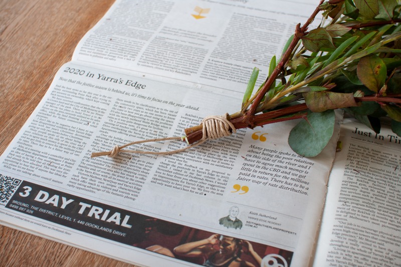 お花やグリーンをまとめたら、崩れないように輪ゴムでしっかりと止めておきます。