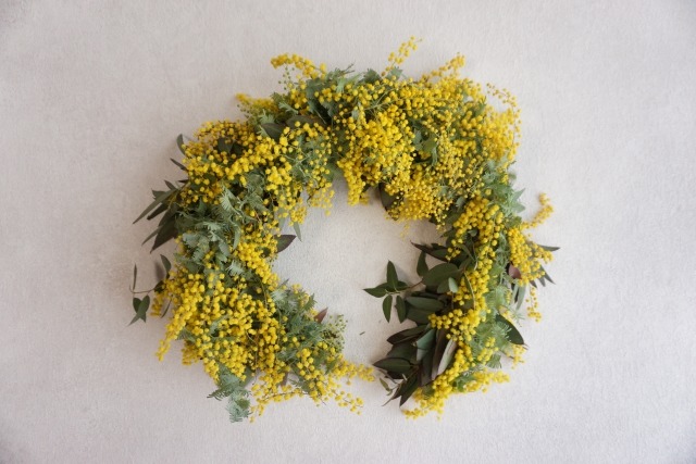 リースにすると、写真のようにポップで可愛らしい印象になりますね。北欧ナチュラルな雰囲気がお好きな方はお家の雰囲気と相性が良さそうです。もう少し大人っぽい印象に仕上げたい方は、ミモザをベースにユーカリやレモンリーフのようなシルバーグリーンの色味を足すと、少しこなれた雰囲気に仕上がりますよ。ぜひ試してみてくださいね。
